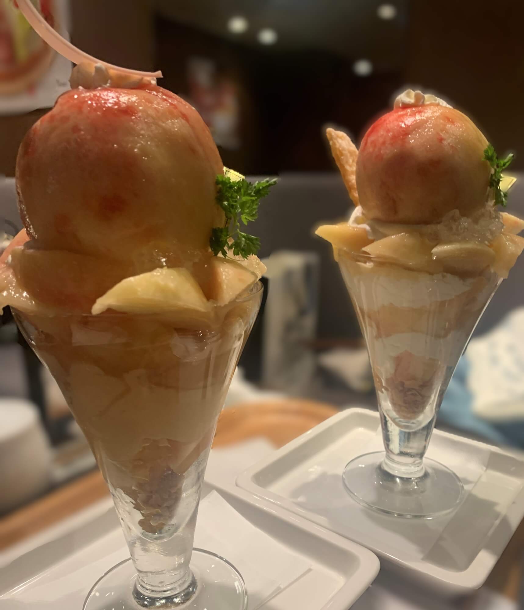 (生クリームをカスタードクリームに変えてもらいましたが、それでも甘すぎて... 桃だけのパフェがよかったです。)